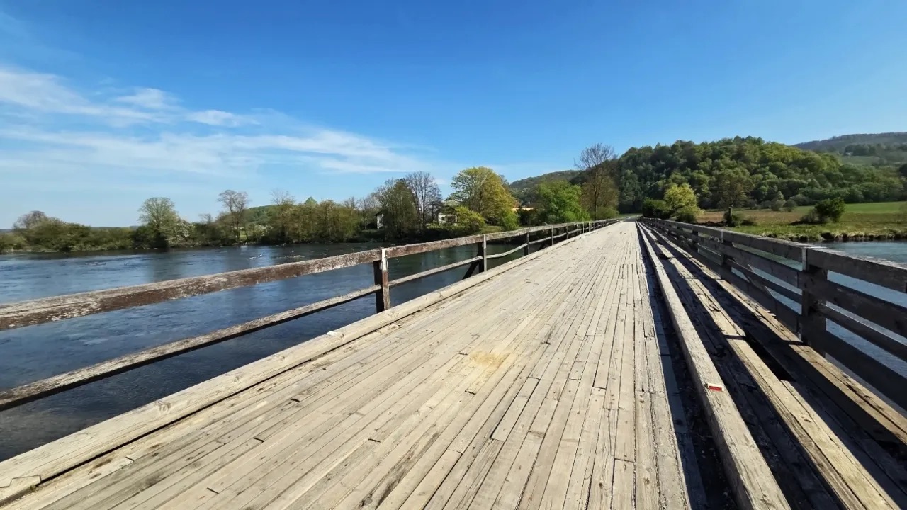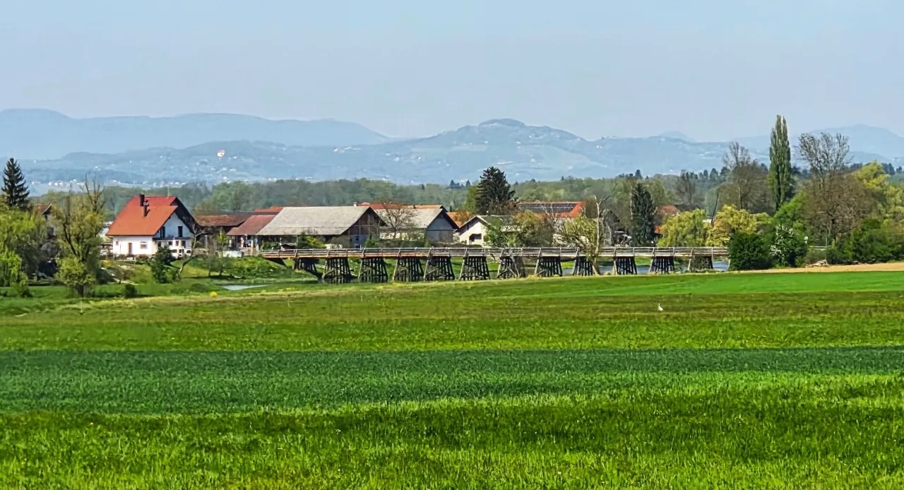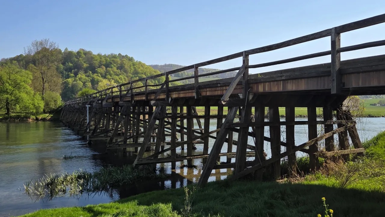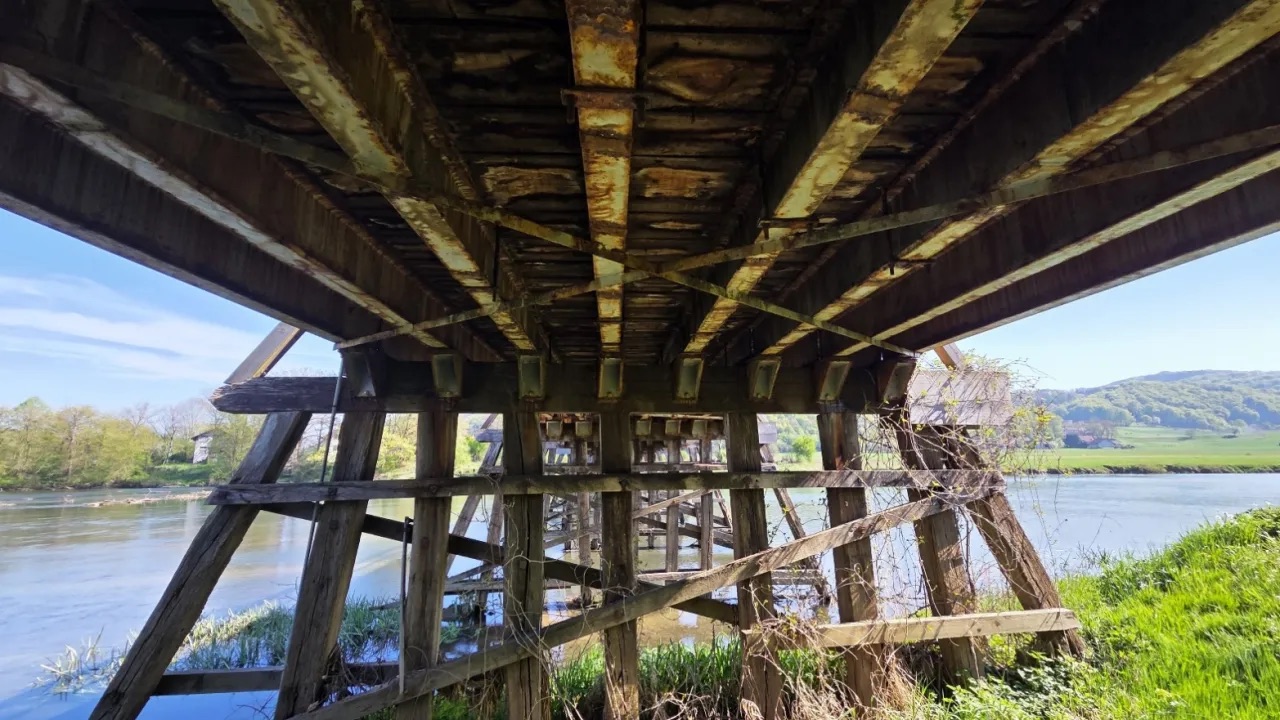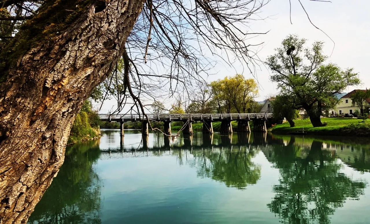 Brjanski most na reki Krki v Podbočju je s 115 metri razpona eden največjih lesenih hibridnih mostov na zeleni reki, ki ji še danes marsikje prijazno rečejo »reka lesenih mostov«. V obeh sosednjih občinah, kostanjeviški in brežiški, skrbno varujejo in ohranjajo dediščino, ki so jo prejeli od prednikov. Foto: Ana Ašič